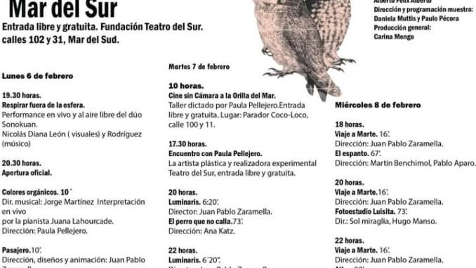 La Fundación Teatro del Sud presenta en su sala (102 y 31, Mar del Sud) la 2da Muestra Nacional de Cine “Mirar en Mar del Sud”, con el apoyo del INCAA, el Ministerio de Cultura de la Nación, y el Municipio de General Alvarado.