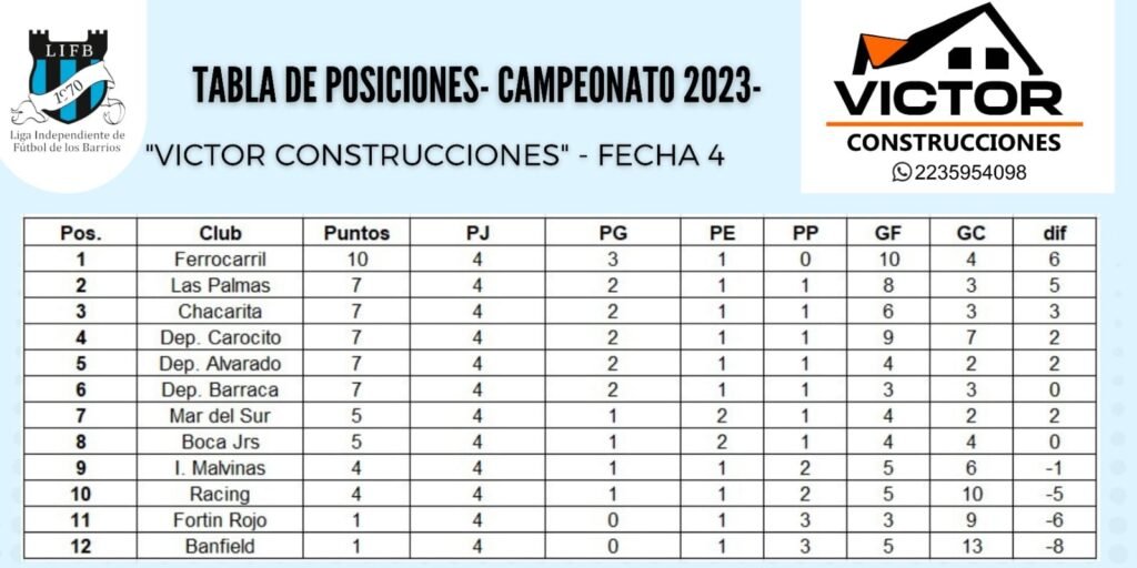 Tras un inicio donde varios equipos compartían el 1º puesto de la liga independiente de los barrios, Ferro ganó un partidazo a Islas Malvinas por 4 a 3 y es único puntero con 10 unidades. Luego hay 5 equipos como escoltas con 7 unidades.