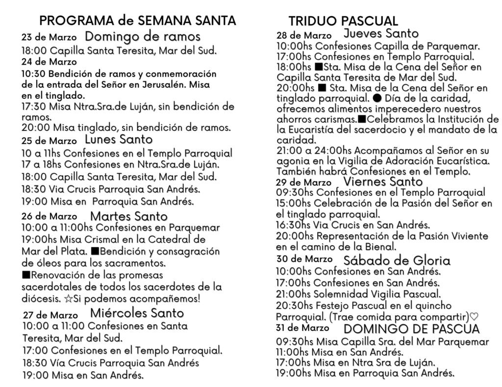 Las principales actividades son: “La Celebración de la Cena del Señor” que el Jueves Santo a las 20 hs., “La Conmemoración de su Muerte” que es el viernes a las 15 hs., “La Fiesta de la Resurrección” que es la vigilia pascual que se realiza el Sábado Santo a las 20.30 hs y el domingo de pascua que se celebra “La Gran Noticia de que Jesús resucitó”: a las 9 hs., en la Capilla de Parque Mar, a las 11 hs. en San Andrés, a las 17 hs. en Nuestra Señora de Luján, y a las 19 hs. en San Andrés.