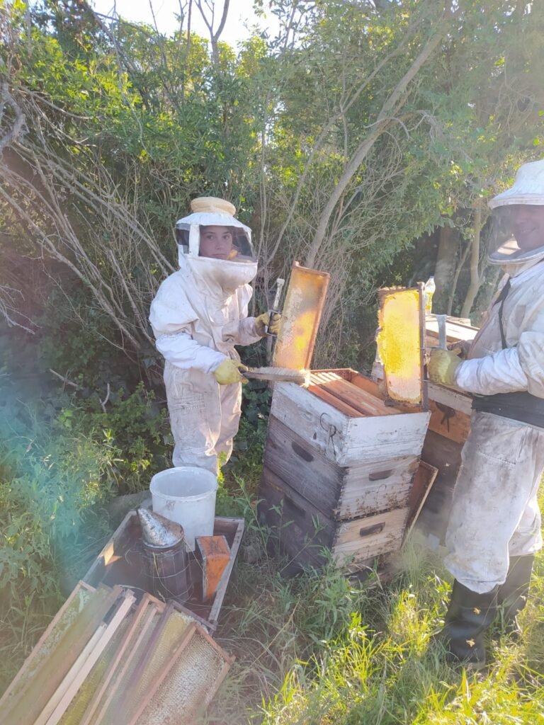 Comenzamos con algunas colmenas en el año 2006 mi esposo (Raúl Lezcano) y yo (Claudia Pons), a partir de ahí fuimos adquiriendo conocimientos sobre la biología de las abejas, las técnicas de manejo y de las enfermedades que padecen. Además, aprendimos viendo trabajar a otros apicultores (ambos tenemos el certificado de apicultor). Elegimos esta profesión porque disfrutamos trabajar con las abejas, producir miel, recorrer el campo y observar las diferentes floraciones, encontrarse con pichones de teros, liebres, zorros…. no lo cambiamos por nada.