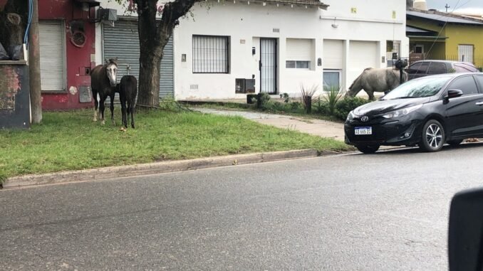 Un vecino de la calle 40 y 31 nos hizo llegar la fotografía que ilustra los caballos pastando en la vereda de enfrente de su lugar de alquiler.