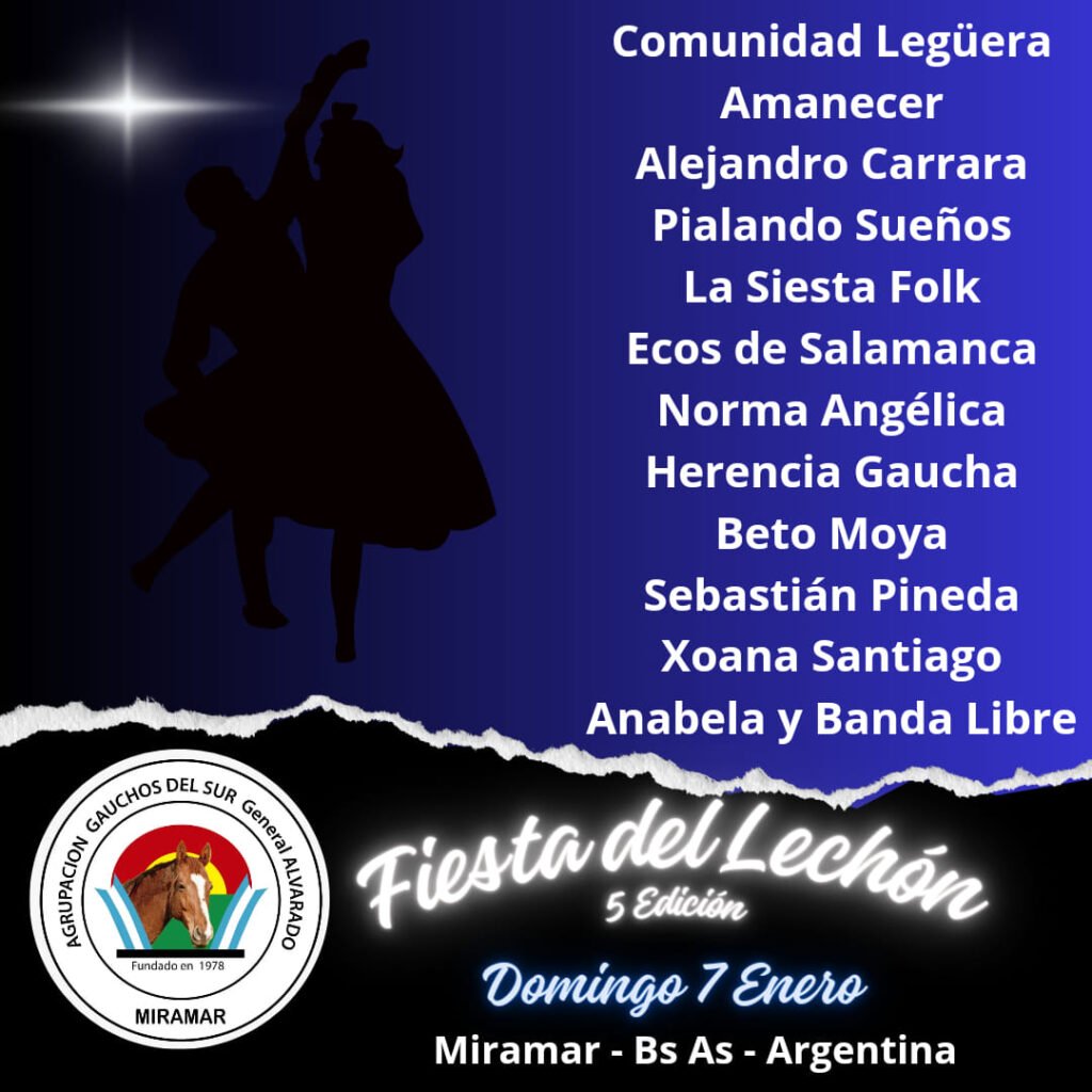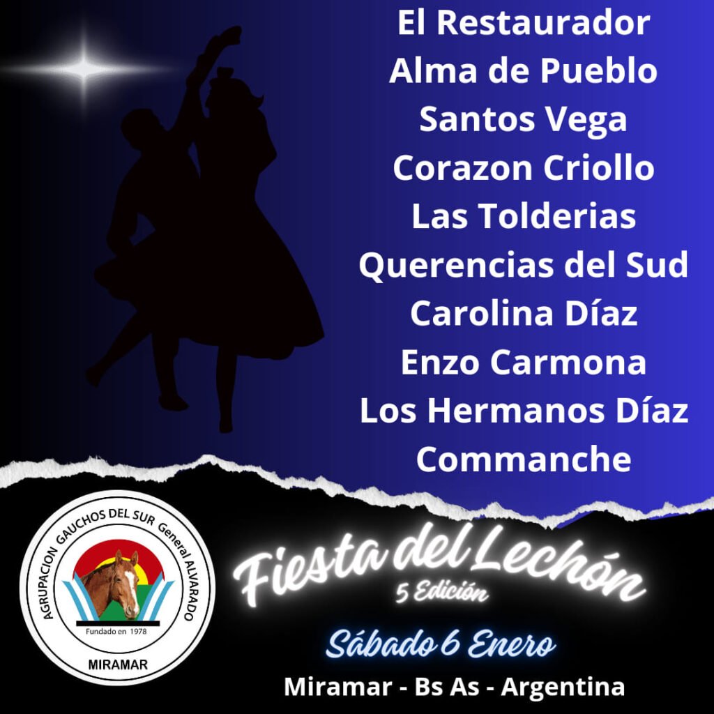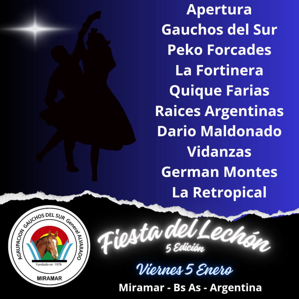 Dentro del marco de la 5° EDICIÓN DE LA FIESTA DEL LECHÓN ,a realizarse en el pago de Miramar los días 5,6 y 7 de Enero en el predio GAUCHOS DEL SUR. Mira el cronograma completo de los tres días.